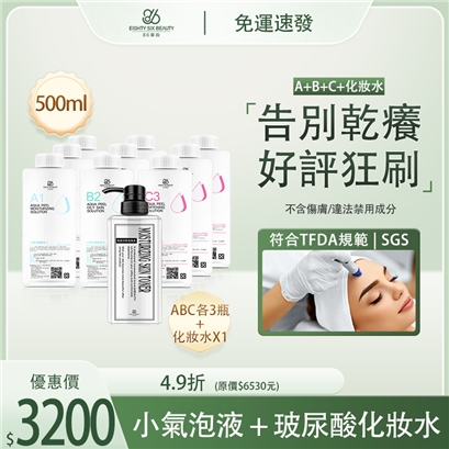 86美妝小氣泡保濕套組,內含A1柔嫩保濕、B2控油舒緩、C3修護提亮營養液各三瓶,並搭配明星化妝水,提供清粉刺後的即時補水與修復。本組符合TFDA規範,採中性無酸配方,敏弱肌亦可安心使用,能有效降低操作客訴。一組可服務75人次,單次耗材成本僅53元,創造13倍純利回報,是美容院穩定收費599元的獲利關鍵。登入官網分享,立即享有最高12%現金分潤回饋,成功推薦9位姐妹下單,本組套餐由86美妝為妳買單,輕鬆達成耗材0元計畫。
